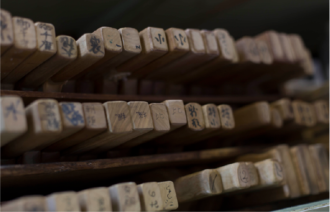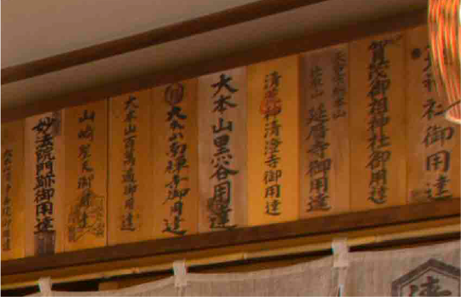 Nameplates of shrines and temples where we supply our treats.