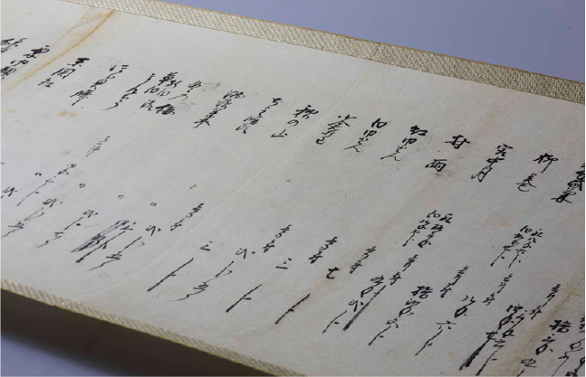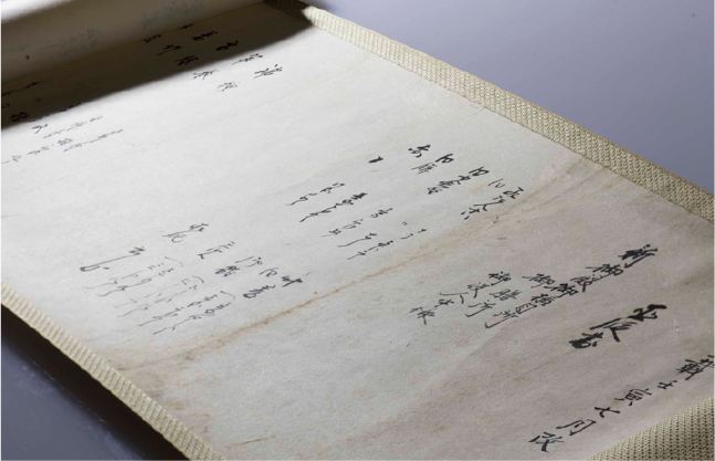 “Gosho-makimono,” a menu of Kashi, which Kameyakiyonaga supplied to the Kyoto Imperial Palace in 1842. It has names of Kashi and prices at that time.