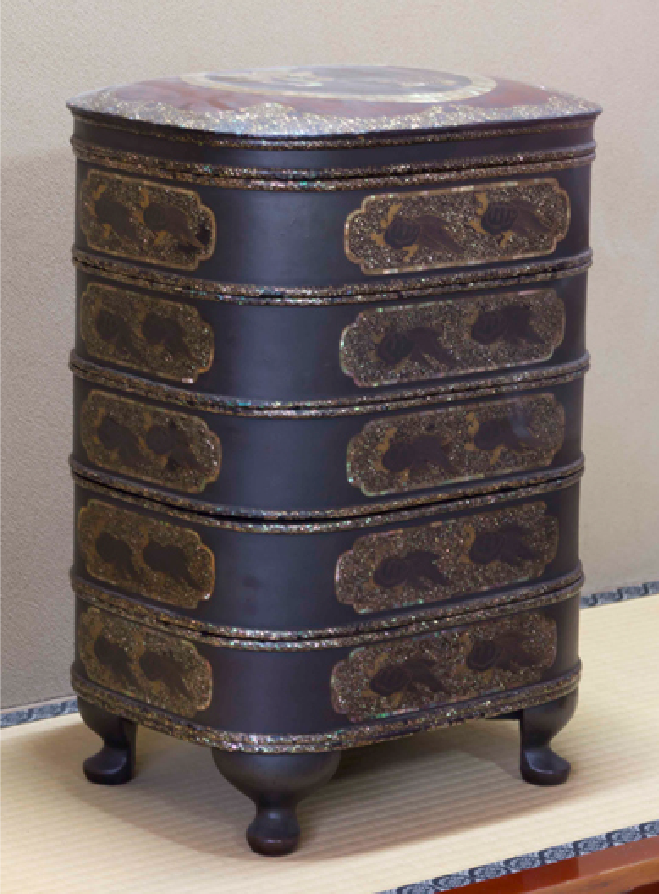A Kashi container, Hokai. People put Kashi in it and brought it to the Kyoto Imperial Palace, shrines, temples and so on. The sides have turtle patterns decorated with lacquer, golden powders, silver powders and thin shells.