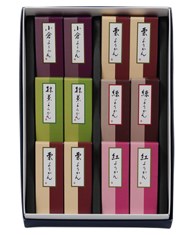 食べきりサイズの自慢の羊羹。黒糖(練羊羹)、小倉、抹茶、梅(紅羊羹)、栗の5つの味をご用意しました。