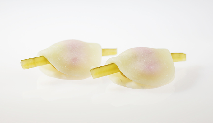 数百年にわたり宮中で使われ、裏千家の初釜でも出される、新年のめでたい和菓子。鮎(年魚)に見立てたゴボウを甘く煮て、白味噌餡とともに求肥で挟んだ京都伝統の味です。