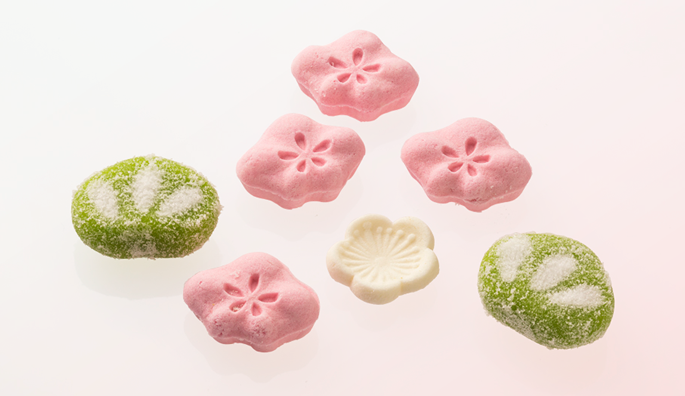 Sweet and sour plum Youkan rolled with Gyuhi (dough made with mochi rice powder) coated with Kouri-mochi (freeze-dried mochi in the winter air).