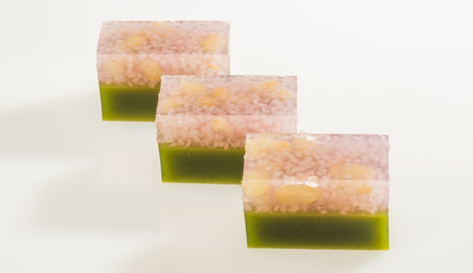 This Youkan (a bar of sweet solid jelly) with Adzuki beans evokes Sakura seen faintly by moonlight. Enjoy and experience the atmosphere of cherry blossoms at night.