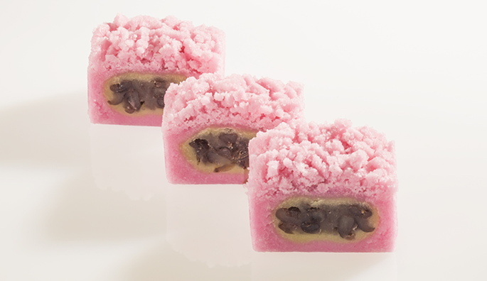 This treat, Adzuki bean pastes covered with Murasame (steamed rice powder,) evokes the image of a beautiful spring day. The light in spring is soft and it shows you everything clear and beautifully bright.