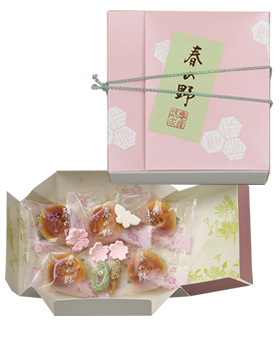 An assorted box of six pieces of Haru-no-no, Momoyama (dough made with white adzuki bean pastes and sugar), and dried confectionaries. This evokes the image of the spring in Kyoto; sprouting buds, budding grasses, singing birds and flowers in full bloom.
