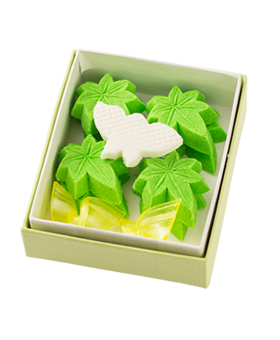 An assorted box of dried confectionaries; green maple leaves and butterflies made from Aruhei-sugar.