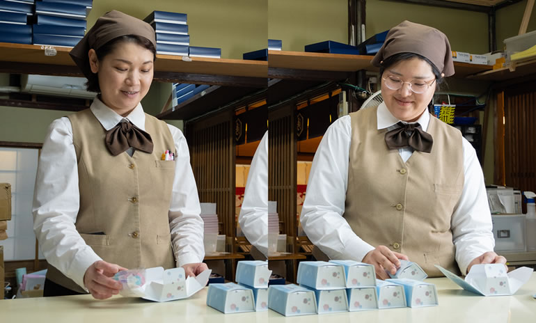 ・入社してまずは当店代表銘菓「清浄歓喜団」の袋詰めや封を閉じる作業や、1日の流れを把握して頂き、またデパート様や売店様へのお届け商品や配送商品の用意を先輩と一緒にして頂きます。